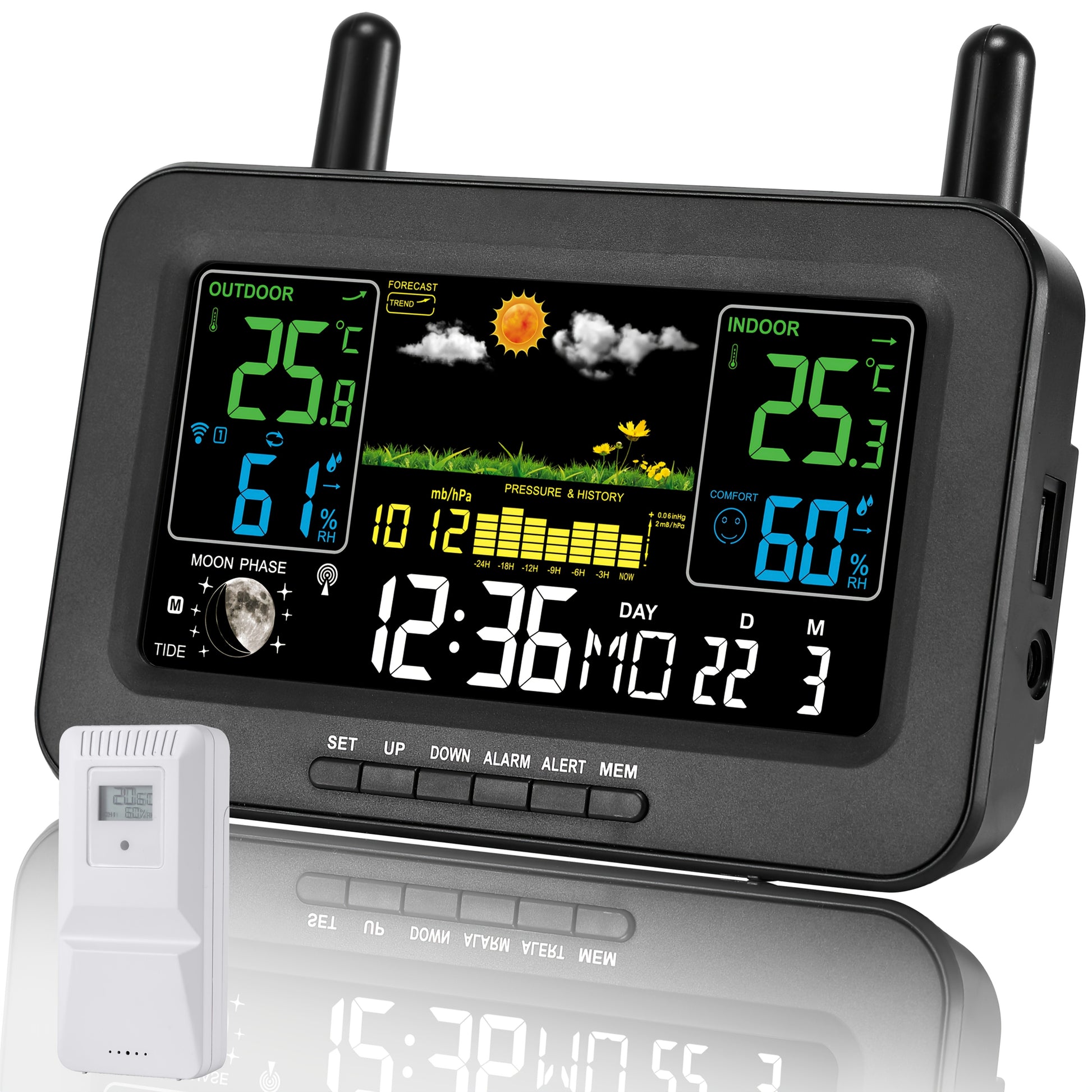 Deze slimme atoomklok van WFV combineert een helder kleurendisplay met draadloze binnen- en buitensensoren voor temperatuur en luchtvochtigheid. Met een eeuwigdurende kalender, maanstand, barometer en USB-oplaadpoort is dit het perfecte multifunctionele station voor thuis of kantoor.